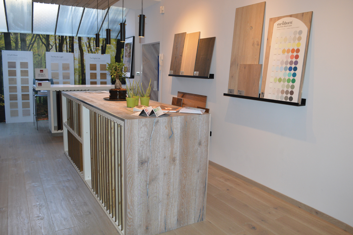 Located on Albemarle Way, with a roof terrace overlooking St John’s Priory, the studio showcases over 200 large Kährs engineered wood flooring samples, ranging from clean boards to expressive, rustic designs.
