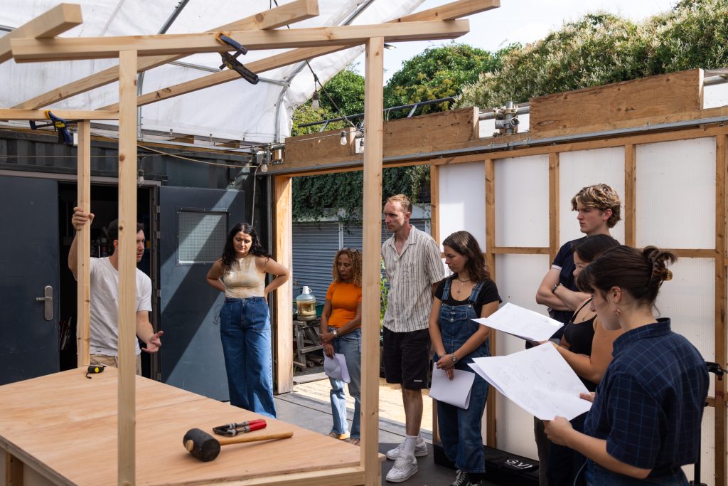 The project originated as a live brief with Central Saint Martins’ architecture students in early 2024. Working with Brockwell Park Community Greenhouses and South London Reclamation, to prototype a kitchen built almost entirely from reclaimed materials, Stride Treglown provided mentoring and practical support to the students, in the week-long workshop that saw them explore circular design through hands-on engagement, ultimately designing a two-part octagonal structure that folds out into a functional, mobile kitchen.