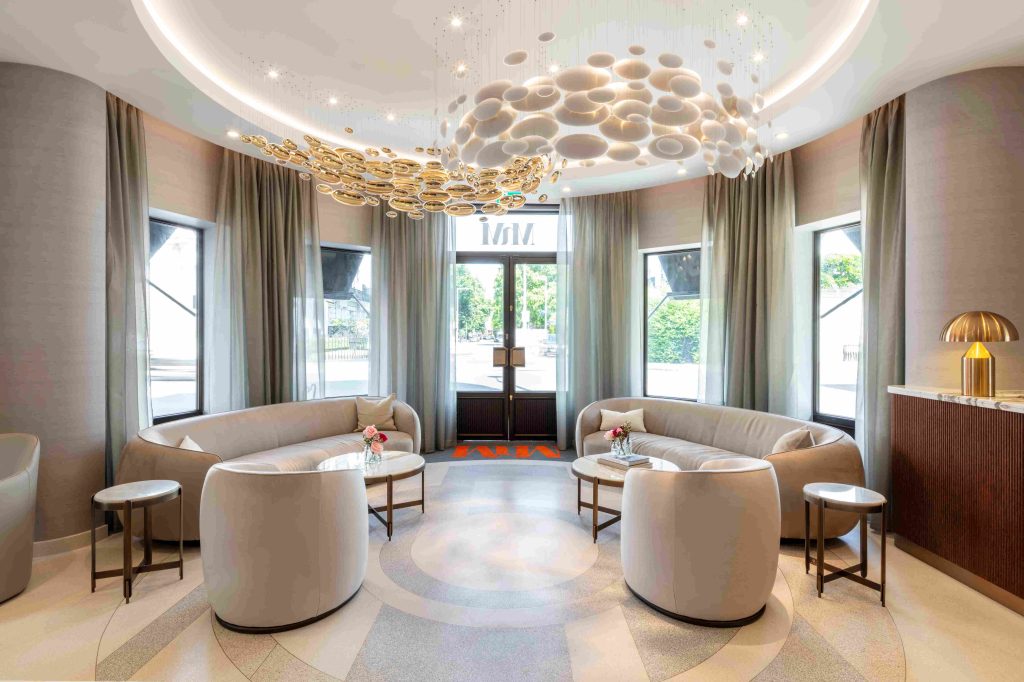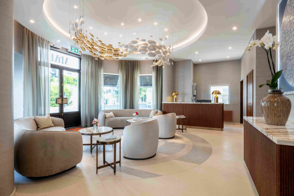 With the curved elevation and ornate detailing to the stonework and openings, this has created a striking point of arrival to the setting. As they enter, guests are welcomed into a high-quality reception area with statement artwork featuring a blessing of wellness in Latin, Hebrew and Arabic. Terrazzo flooring includes a brass inlaid motif, with bespoke furniture and a contemporary blown-glass chandelier. A secondary discreet entrance off Pond Place connects directly to the staircase and lift for patients arriving by bed.