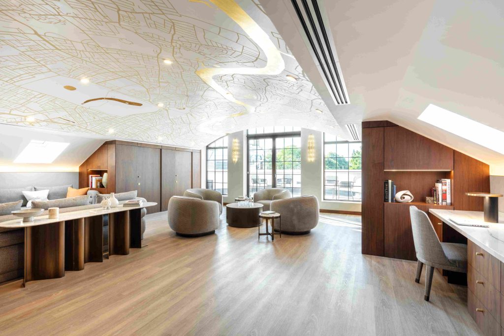 Stretching across the length of the wellness room’s ceiling is a gilded map of the City of London by London artist Ewan David Eason. Complete with a golden River Thames, the artwork is the largest-scale map of London in the UK.